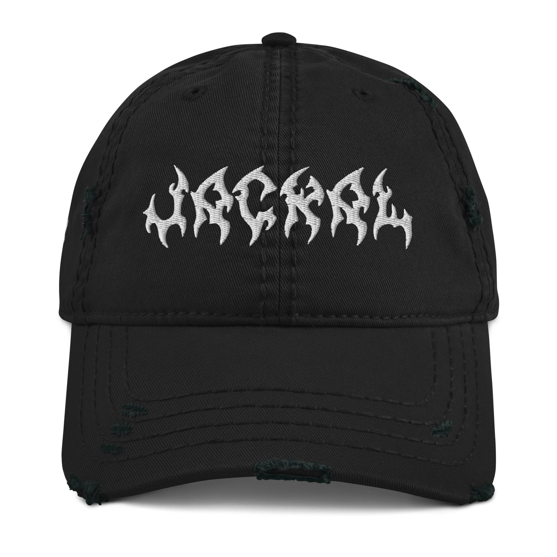 Increase your headwear options by adding this stylish dad hat to your collection. The distressed brim and crown fabric add a touch of edginess that perfectly complements any outfit. Moreover, the embroidered front and side designs cement the hat with a dark, alternative vibe. For effortless style, pair it with the "AUS DER ZEIT" oversized tee.